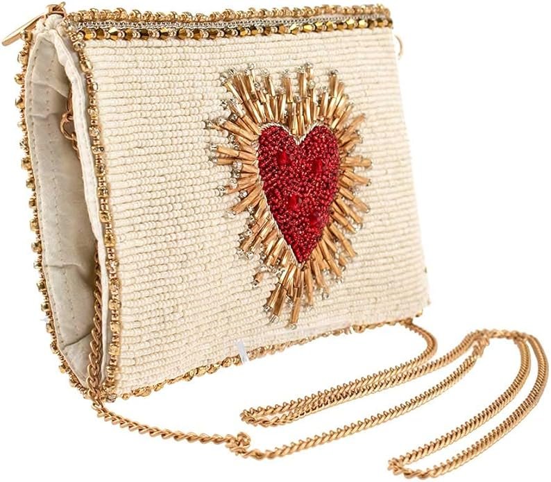 This charming crossbody phone bag is inspired by the sacred heart and is a seasonal favorite with gorgeous gold beams and contrast edging. Hand-beaded using new techniques, the center opulent heart is finished with bright multi-dimensional red beads. This little bag is perfect for the girl on the go! Top slip pocket to secure glasses or your phone and a side zip pocket to secure cards, cash and your lip gloss.